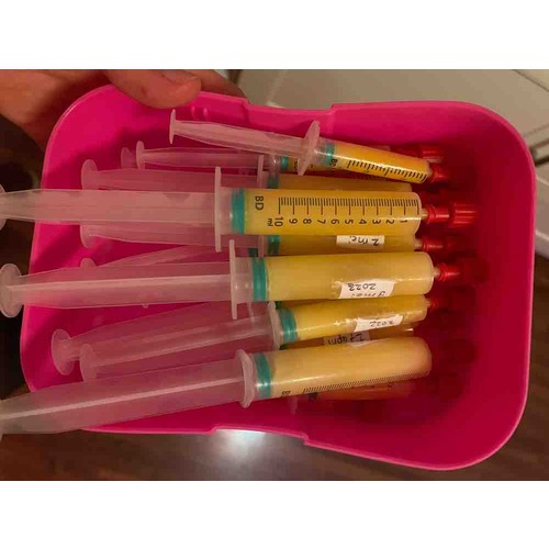 Nu bij de derde kreeg ik wel het advies om alvast te kolven (ik word met 37.6 ingeleid) en ik had bedacht dat ik het in ieder geval kon proberen. Ik merk dat mijn productie nu langzaam al wat toeneemt en ik heb een paar spuitjes met colostrum voor als dit straks toch nodig blijkt te zijn.