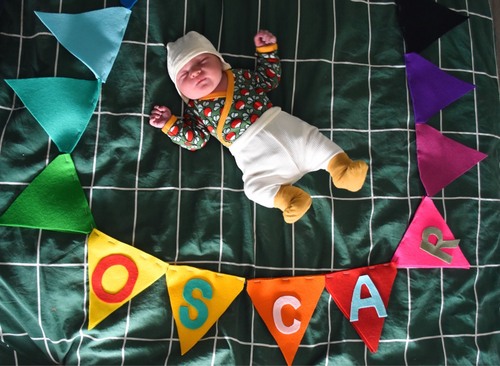 Ik had deze slinger gemaakt tijdens de vorige zwangerschap (de letters er na de geboorte opgeplakt omdat we het geslacht niet wisten). Nu heb ik weer een vlaggenlijn gemaakt met de naam, nu weten we het geslacht wel. Die vlaggen hebben we voor het raam gehangen samen met een ooievaar die ik gehaakt heb 😁