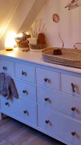 Wij hebben de gouden knopjes van xenos! Ook dieren/jungle thema dus voor op de kast hebben we de bladeren en voor op de commode de olifantjes 😊