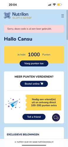 Vanaf Nutrilon 2, als je een nieuw pak hebt zit er zo’n folie met een QR-code in. Als je deze scant en een account aanmaakt spaar je elke keer 100 punten, en bij een x aantal (weet even niet precies hoeveel) krijg je geld teruggestort via een tikkie.