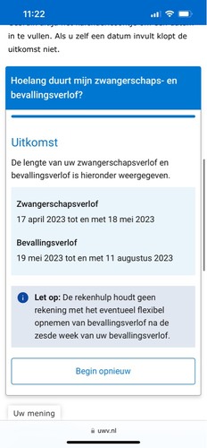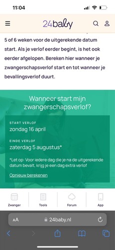 Zie ik goed dat je met 36+2 met verlof bent gegaan? Daar komen de twee dagen verschil vandaan. In principe moet je met uiterlijk 36+0 met verlof, als je langer doorwerkt dan krijg je die dagen niet terug. Dus ‘officieel’ is je eerste verlofdatum 15-04 en daarom klopt 8 en niet 10.