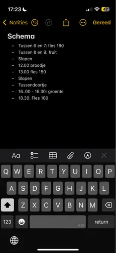 Daarna brood of 2 crackers en vaak wat groente erbij. Uur na de lunch een fles van 180, die gaat niet altijd helemaal op.