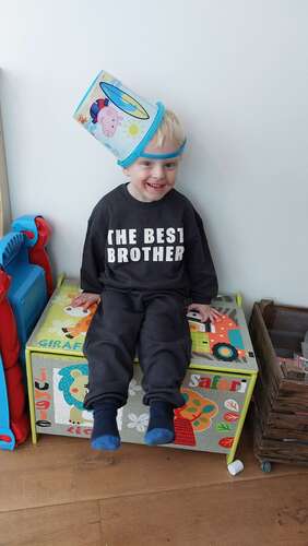 Deze gisteren gemaakt. Wilde hem eigenlijk laten poseren met zn haartjes gedaan enzo maar toen deed hij opeens een emmer op zn hoofd en ging hij daar zitten. Vond ik een leuke spontane foto 🥰