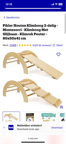 We hebben een houten klimboog gekocht en alvast gegeven. Nou wat een hit! Hij trekt zich er continue aan op. Er zit zo’n glijbaan bij en daar klimt hij steeds op.