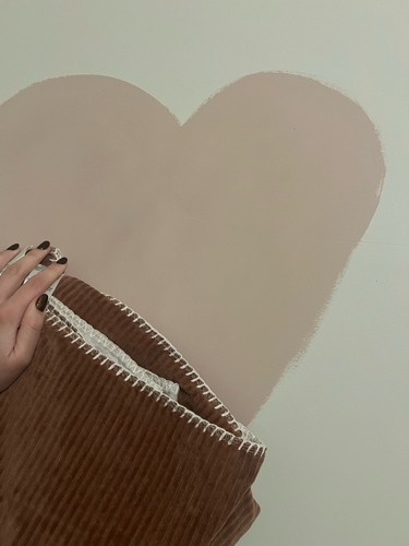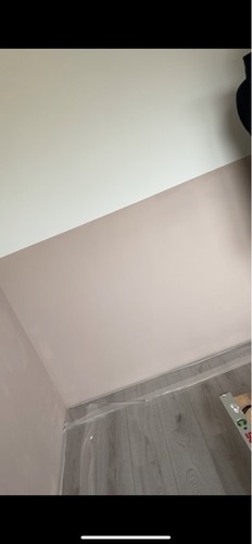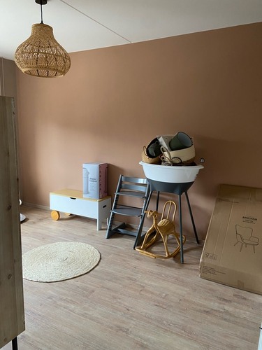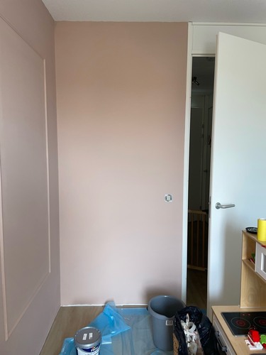 Hier zie je ‘m bij ons op de wand. Hij lijkt de ene keer wat meer roze en dan weer meer richting beige, ben er heel blij mee. Je kan deze kleur natuurlijk ook laten mengen in gewoon Gamma verf o.i.d. maar ik vond zelf de Histor wel heel fijn schilderen en deze verf is afneembaar ☺️.