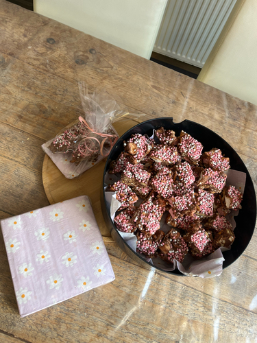 Ik heb Rocky road gemaakt met spekjes, chocola, zoute pepsels en biscuit. Was erg lekker!