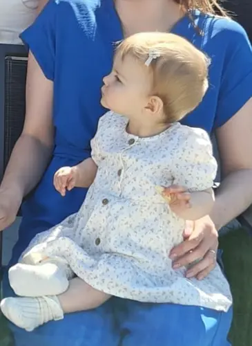 Mijn dochter loopt en staat ook nog niet en heeft ook weinig haar haha. Ze droeg dit met haar verjaardag (blouse en gilet van zara en broekje van donsje)