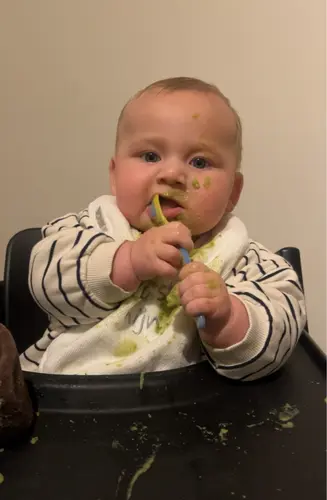 Ik geef vaak ‘s avonds gepureerd maar maak soms ook weleens een ei muffin, stronkje brocolli of andere stukje. Tot nu toe is het veel sabbelen, kauwen en uitspugen/valt uit z’n mond. Doorslikken heeft hij nog niet echt door behalve bij vloeibaar of puree.