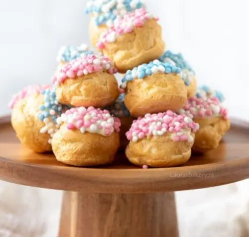 Ik had bij onze dochter die mini tompoucjes met roze muisjes op de bovenkant(met een klein beetje boter om goed te laten plakken). Nu voor ons jongetje gaan we voor soesjes uit de vriezer met witte chocolade pasta en blauwe muisjes.