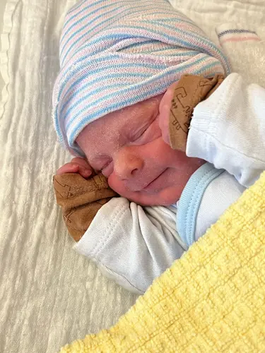 Om 07.00u half slaperig voel ik iets tussen mijn benen.. ben ik nu aan het plassen? Ineens komt het besef.. "mijn vliezen zijn gebroken"! Binnen 30 minuten spullen bij elkaar gezocht en de auto in, toen begonnen ook al de eerste krampen. Uiteindelijk is Fenn om 18.11u geboren en gaat alles gelukkig goed! 🩵