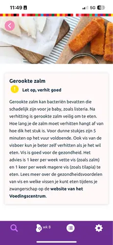 Daarnaast: download even de Zwangerhap app en zet bij de instellingen de pushmeldingen voor veiligheidswaarschuwingen aan. Dan ben je direct op de hoogte, mocht er iets aan de hand zijn met jouw zalm.