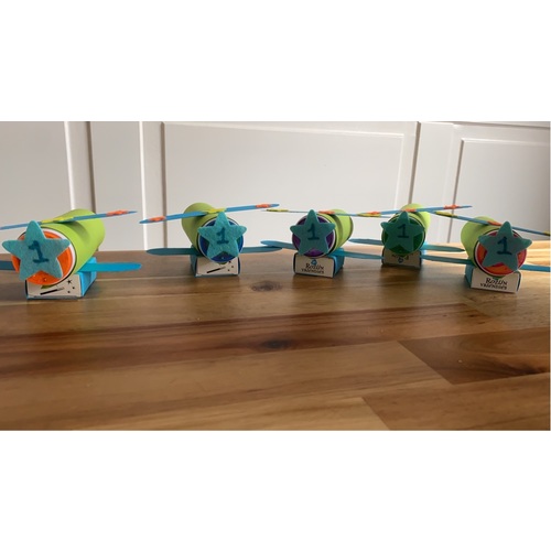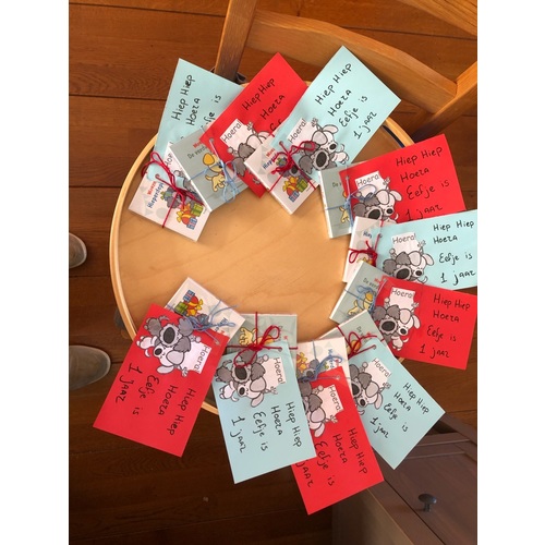 Ik ben niet heel erg origineel en heb dit van pinterest. Ik heb een doos krijtjes gekocht, nijntjes uitgeprint en maak t koekje vast tussen de krijtjes en het nijntje. Op het nijntje zet ik nog STELLA en in de ballon 1. Voor de leidsters hetzelfde, alleen dan met een merci'tje er tussen 😊