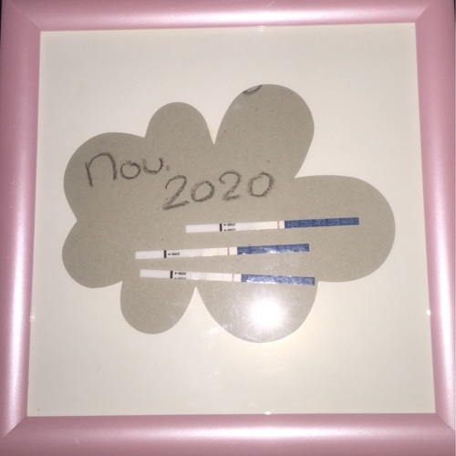 Ik schilder als hobby en had een leuk simpel schilderij gemaakt met een lichaam, buik en borst met een hartje in de buik. Daarboven had ik met stift “ NOVEMBER” geschreven. Door deze tijden zien we elkaar niet fysiek en hadden we via Teams (microsoft) elkaar gebeld. Zo kon ik alle zes (ouders+ broertje en zus) zien op een beeld (aan de tv gekoppeld). Ik heb met mijn telefoon opgenomen hoe ik ze mijn laatste kunstwerken liet zien met als laatste die met de buik...
