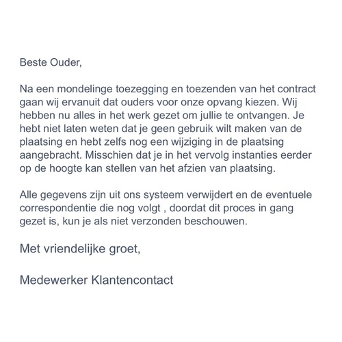 Bij mijn organisatie wordt er alleen een kleine vergoeding voor alle administratieve werkzaamheden verrekend indien je toch niet van start wilt gaan met de aangevraagde opvang.