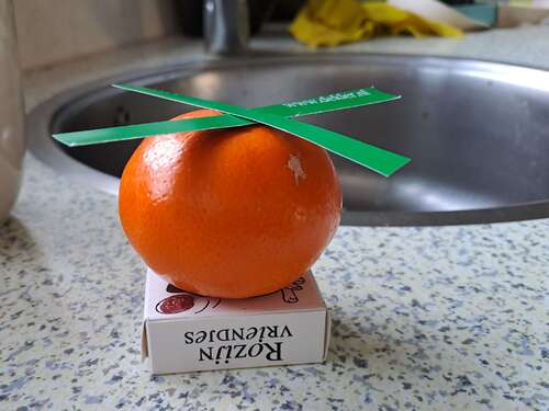het wordt en mandarijn én rozijntjes. Dit wordt het idee. Onze dochter herkende het als helikopter en dan is het prima ;-). Dit weekend even netjes voor de hele groep maken.