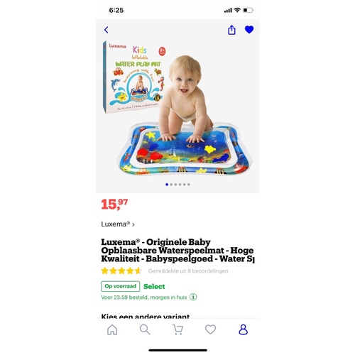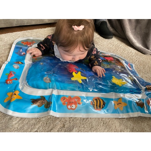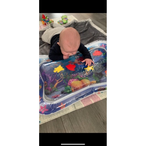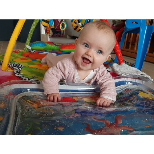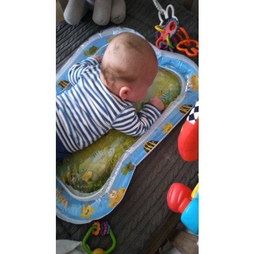 Een waterspeelmat is dus zo een opblaasbaar ding met in het midden figuurtjes en water dat je moet toevoegen en als je de baby er op zet kan hij ermee spelen.