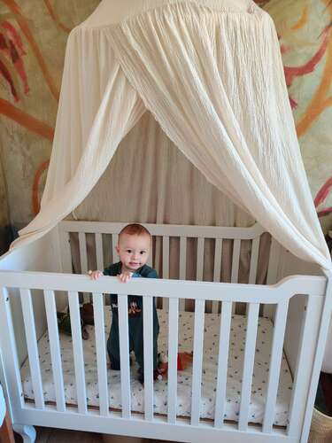 De klamboe hangt er al een jaar boven en met de babyfoon horen we het snel als hij wakker is.
