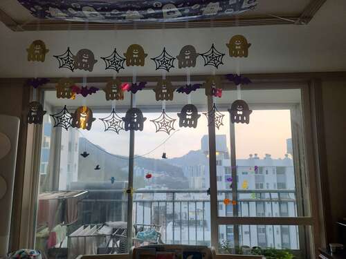 Ik heb deze spookjes boven de grondbox van mijn zoontje hangen, een soort jelly raamstickers en een slinger die ik zelfgemaakt heb van vilt. Hij is alleen wat oneven, dus wil er nog 1 figuurtje bij maken.