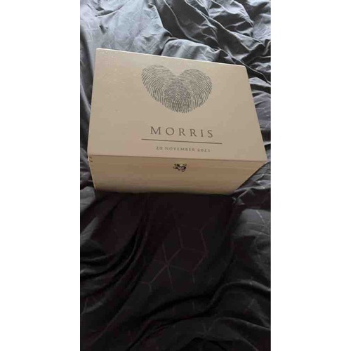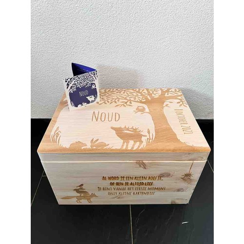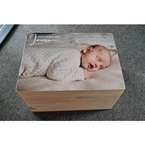 Mijn broer heeft een houten kist laten maken met de bovenkant hetzelfde als het geboortekaartje. Zijn er super blij mee