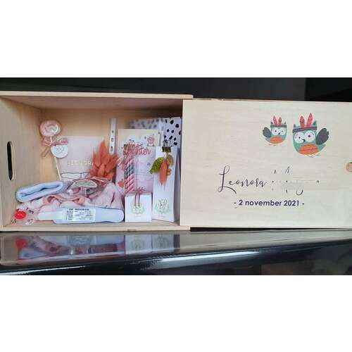 Ik heb de mijne ergens anders laten maken maar ik zag dat ze ook herinneringskisten bij feestje van hout maken. Die kan je ook laten personaliseren met het geboortekaartje.