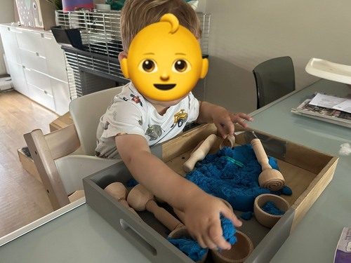 Mijn zoontje heeft er laatst bij een vriendin mee gespeeld. Ik had al gewaarschuwd dat het mij niet slim leek en het dan overal zou gaan zitten.. maar neeee, want dit is niet “echt” zand, het plakt aan elkaar! En het zit in een bakje dus komt wel goed.