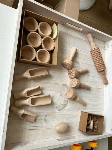 Ik heb wat houten bakjes, ringen en stempels die hij begraaft, mee stempelt, vult en weer leeg gooit….