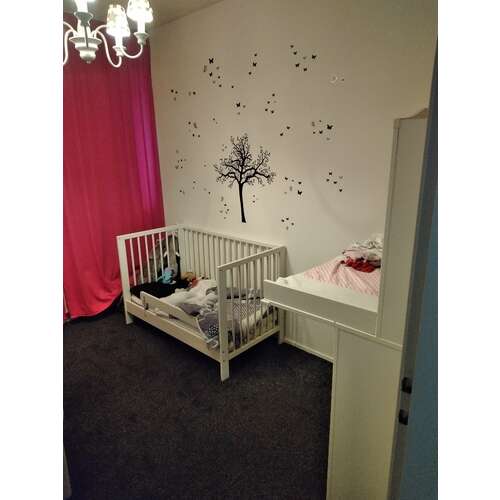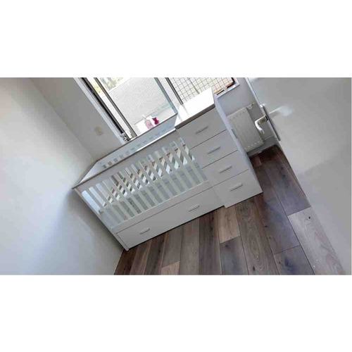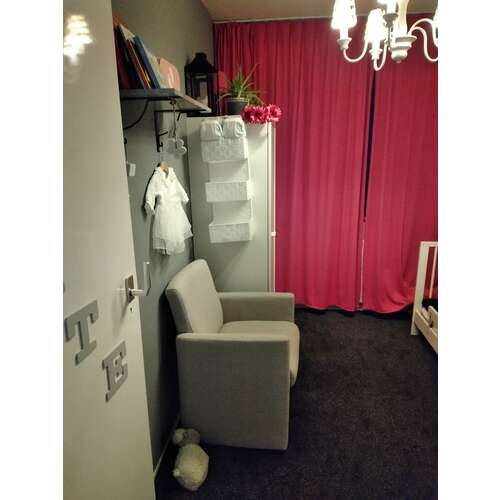 O oke vandaar. Dus echt aan de zijkant. Ik denk dat onze baby kamer net zo groot is. Alleen de deur zit bij ons links in de korte muur. Ik heb het idee bij jou in het midden? Wij hebben het ledikantje rechts tegen de lange muur staan en een kleding kast+ stoel links er tegenover. Een losse commode zonder lades rechts naast de deur tegen de korte wand dus. Ik ervaar de kamer echt niet als te klein. We hebben een meter hang gedeelte in de kast en we hangen alle shirts/ jurkjes/ truien op. De rest ligt er onder. We hebben dit nu nog voor ons 2e kindje en binnenkort leeg maken en inrichten voor onze 3e