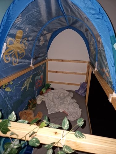 Alleen afgelopen nacht (2de keer sinds hij in het grote bed slaapt) werd hij weer ontroostbaar wakker. Ik heb bijna een uur bij hem gelegen, en die matras is niet geschikt voor een volwassene 😅 En dus ook niet voor een eventuele logee 🫣