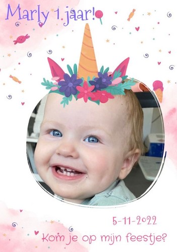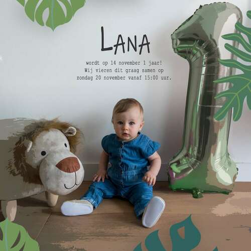Wij hebben een digitaal kaartje gemaakt, heb haar een rompertje aangetrokken met de tekst “sofie 1 jaar” en daar een tekstje naast met als achtergrond de achterkant van haar geboortekaartje