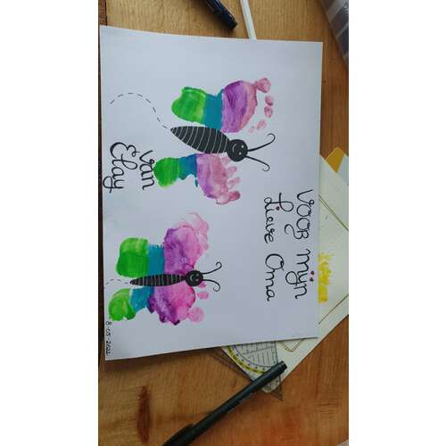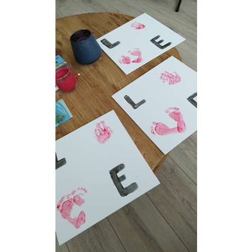 Gemaakt door in de wipstoel te zetten op tafel en met een kwast het voetje te verven. Ik wachtte tot hij zijn tenen omhoog deed en deed dan zijn voetje op het papier. Duwde de teentjes naar beneden en dit was het resultaat馃槉 handjes is nog wel echt onmogelijk