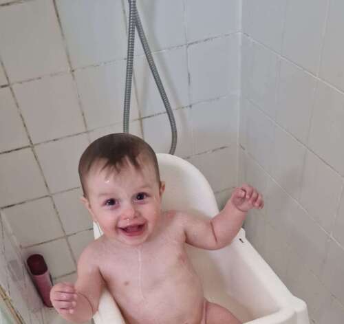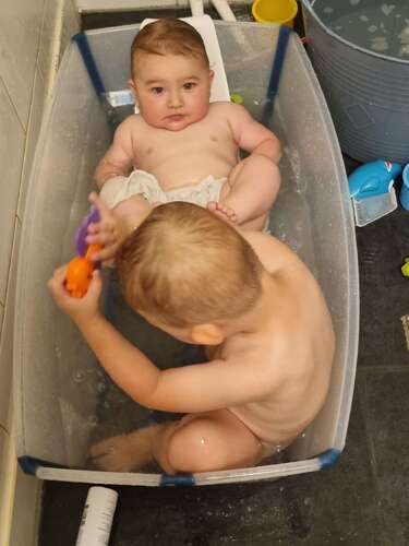 Ik gebruik een badzitje in de douche. Werkt echt super goed, elke avond even afspoelen voor dat ze naar bed gaat.