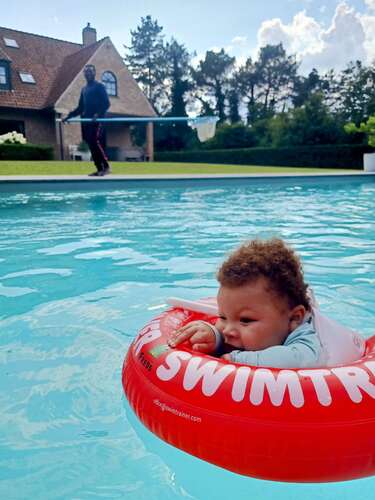 Wij zijn naar baby spa gegaan en ze hebben een drijfmaatje aan onze baby van 6 maanden aangedaan, het meisje was erg jong en het ging een beetje stroef en eng. Papa vond het helemaal niks. Maar bij het zwemmen met een zwemband van Prenatal blijft ons kind de hele tijd zuigen op het rand en zuigt ook chloor water.