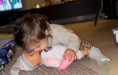 Onze dochter is ook groot fan van haar pop die ze van de sint kreeg. Pop krijgt kusjes en wordt in en uit haar poppenwagen gehaald.🥹🩷