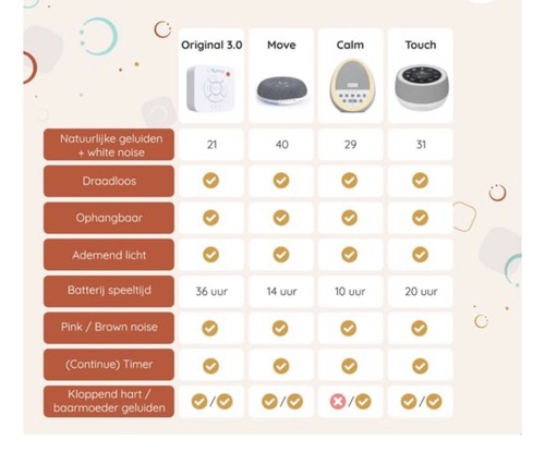 Ik heb zelf deze. Ben er wel tevreden over. Je hebt veel verschillende soorten geluiden hoewel ik eigenlijk alleen de white noise gebruik en één kleur lampje (je hebt meerdere kleuren en kan ze ook in sterkte aanpassen). Mijn zoontje slaapt hierdoor veel beter en wordt niet meer wakker van elk geluidje. Als hij ‘s nachts uitvalt door lege batterij wordt hij zelfs wakker dus denk wel dat het een soort “verslaving” is😂