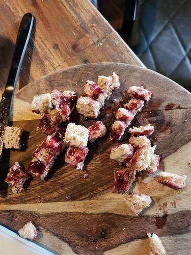 Het brood beleggen we met een dun laagje boter en pindakaas of jam, sommige starten met bijvoorbeeld alleen boter. Dan snijden we de boterham in kleine vierkantjes (postzegel formaat ongeveer).