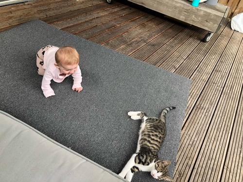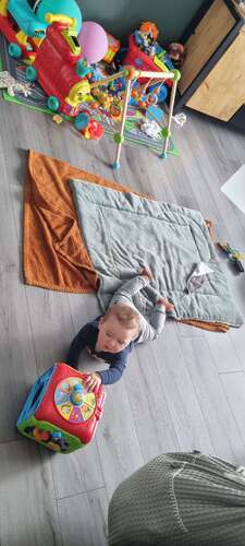 Speelmatten vind ik trouwens niet zo handig. Daar hebben ze niet zoveel grip op en dat helpt niet echt met het kruipen.