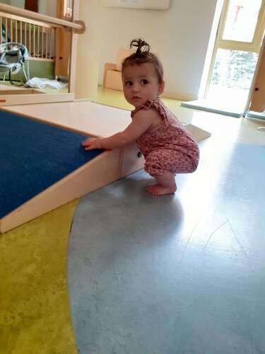 Op de opvang hebben ze ook niets op de vloer. Is voor de grip wel echt fijner. En anders kun je van die speelmatten doen. Die zijn ook vrij stug.