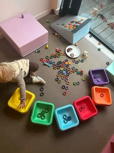 En dan het leukst in combi met een set stapelstenen (wij hebben van Jindl, niet die dure) en nog wat gekleurde pittenzakjes. Eindeloos vari毛ren!