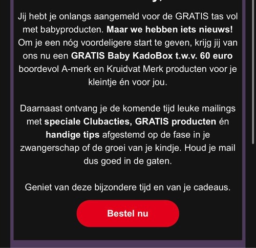 Er is sinds een paar dagen een nieuwe babybox van kruidvat. Je meldt je zwangerschap dan via jouw account, dan bestel je de babybox voor €0.01 en die kan je dan na een paar dagen in de winkel ophalen.