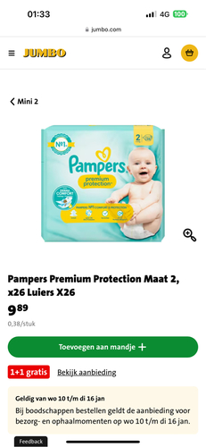 Ik kijk altijd op luieraanbiedingen.net waar de pampers het goedkoopst zijn. Meestal betaal ik 19 cent per pamper.