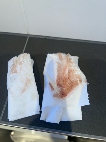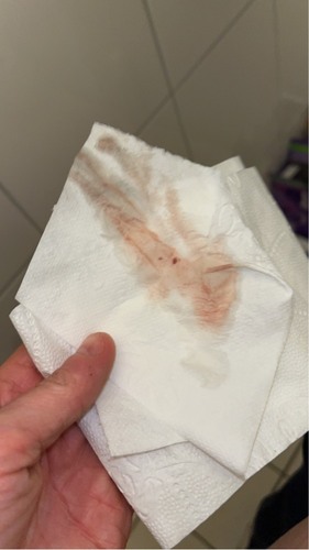 Sinds vanmiddag heb ik ineens hele erge buikpijn, soort menstruatie krampen en na het plassen zat dit op het toiletpapier.