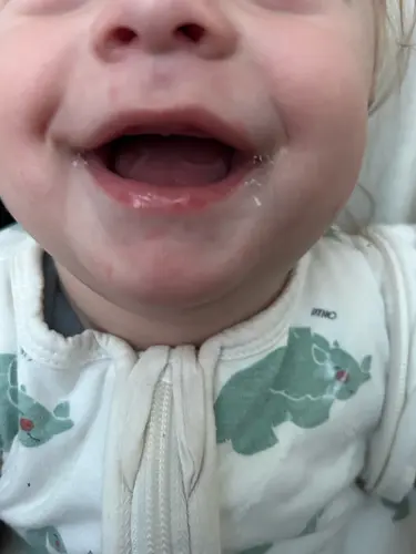 Heb zoiets nog nooit gezien bij doorkomende tanden.. denk eerder misschien aan een hand voet mond ziekte evt. Of andere kinderziekte.