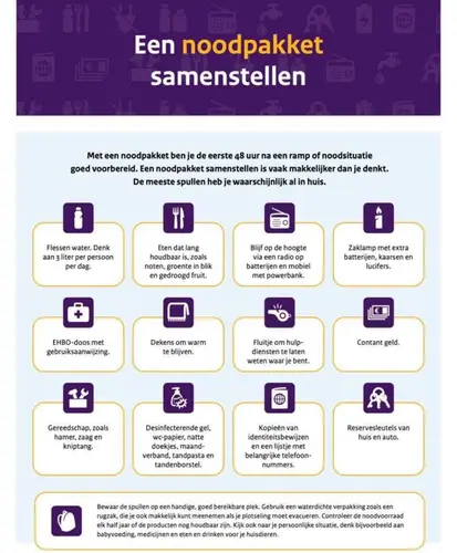 Veel dingen van het noodpakket heb je waarschijnlijk al in huis. Check dat eens en wie weet stelt je dat al wat meer gerust. Dingen die je niet hebt, kun je eventueel meenemen bij het boodschappen doen. Zo stel je hem zelf beetje bij beetje samen en heb je straks een compleet pakket. Dat geeft rust en zelfvertrouwen dat jij je kunt redden.
