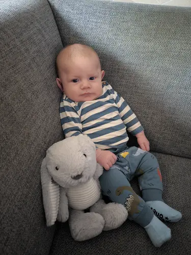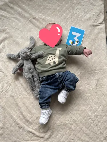 Broekje van Zeeman, truitje van Wibra, schoentjes zijn van Nike :) Gekregen van z'n tante voor kerst! Natuurlijk even aan voor de 3-maanden foto!