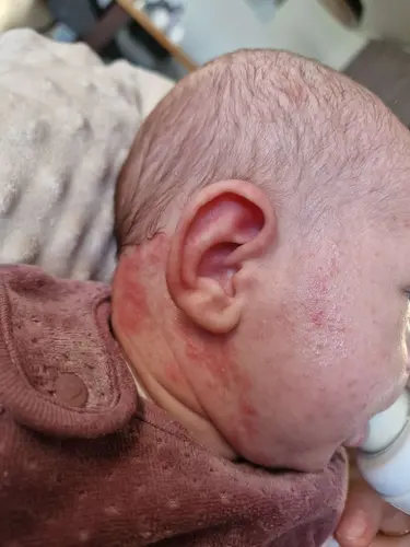 Mijn zoontje heeft precies hetzelfde! Het ziet er zo pijnlijk uit. Ik dacht misschien eczeem, maar durf zonder medische controle niets te smeren. Ik dep er alleen moedermelk op als het schilferig wordt :(