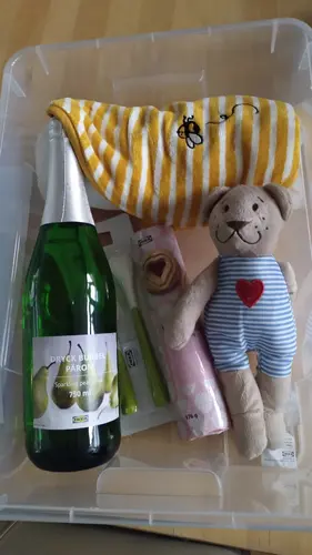 Is alleen in duiven ja, er zit een knuffeltje in. Badhandoek met capuchon, lepeltjes, fles bubbels perensap & koekjes. Daarnaast is de box zelf een plastic opbergbox dus ook wel praktisch. Ik vond het wel waard omdat alles te gebruiken is en er niet zoveel folders en shit inzit