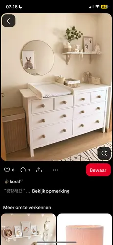 Wij hebben gewoon een ronde glazen spiegel boven de commode. Beetje zoals op de foto voor de eerst en straks ook voor de tweede . Je staat ernaast als ze op de commode liggen dus als ze er naar rijken gewoon corrigeren gaat bij ons al ruim twee jaar zonder problemen. En onze dochter kijkt graag naar haarzelf of hoe we der haren doen