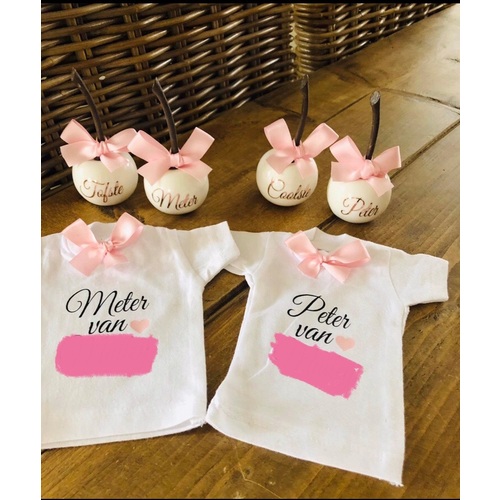 En dan mini t shirts voor over een fles cava waar dan op staat “Meter van ..” en “Peter van ..”