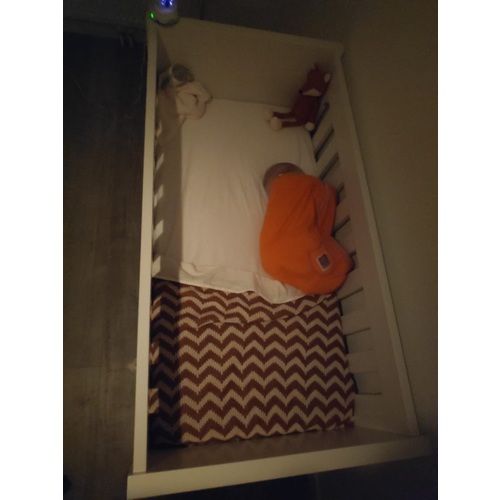 Onze kleine slaapt ook al iets langer dan een maand in zijn ledikant in zijn eigen kamer. Paste niet meer in zijn wieg.