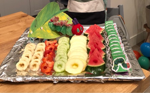 Ter inspiratie: vorig jaar hebben we een fruitschotel gemaakt waar Rupsje Nooitgenoeg allemaal gaatjes in had gegeten. De knuffel kwam van Bol.com en het blad had ik gekopieerd uit het boek.